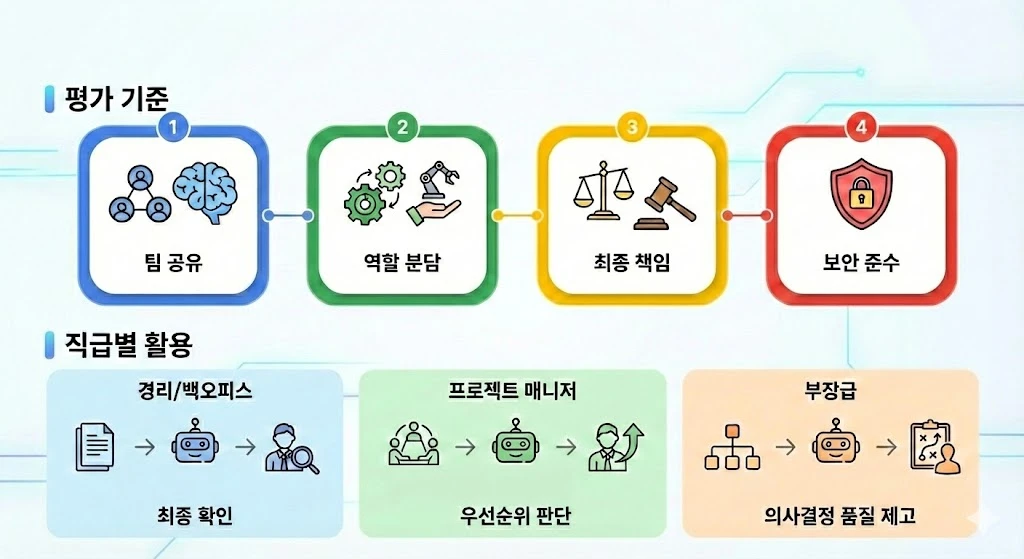 이런 변화는 직급별로도 다르게 나타납니다. 경리·백오피스 매니저는 AI를 초안 작성과 정리에 한정하고, 최종 확인은 반드시 사람이 수행하는 구조를 만듭니다. 프로젝트 매니저는 회의록 요약이나 리스크 탐지에 AI를 활용하되, 우선순위 판단은 직접 내립니다. 부장급 미들 매니지먼트는 개인 효율보다 조직 전체의 정보 흐름과 의사결정 품질을 높이는 도구로 AI를 포지셔닝합니다.