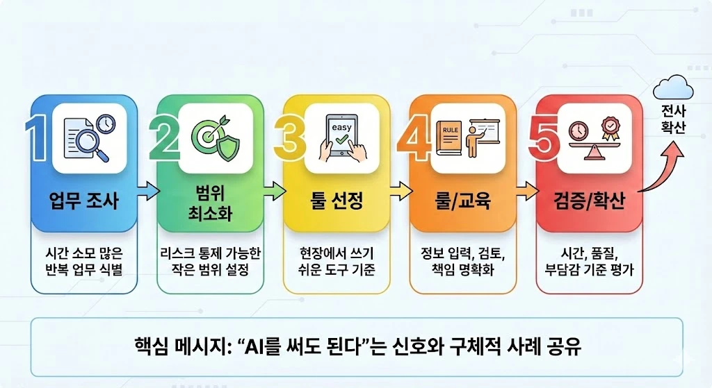 도입 이후에는 이용 룰과 교육이 따라붙습니다. 어떤 정보를 입력해도 되는지, AI 결과물을 어떻게 검토해야 하는지, 최종 판단 책임자는 누구인지까지 문서로 명확히 합니다. 마지막으로는 업무 시간 변화, 결과물 품질, 현장 부담감을 기준으로 효과를 검증하고, 확산 여부를 결정했습니다.