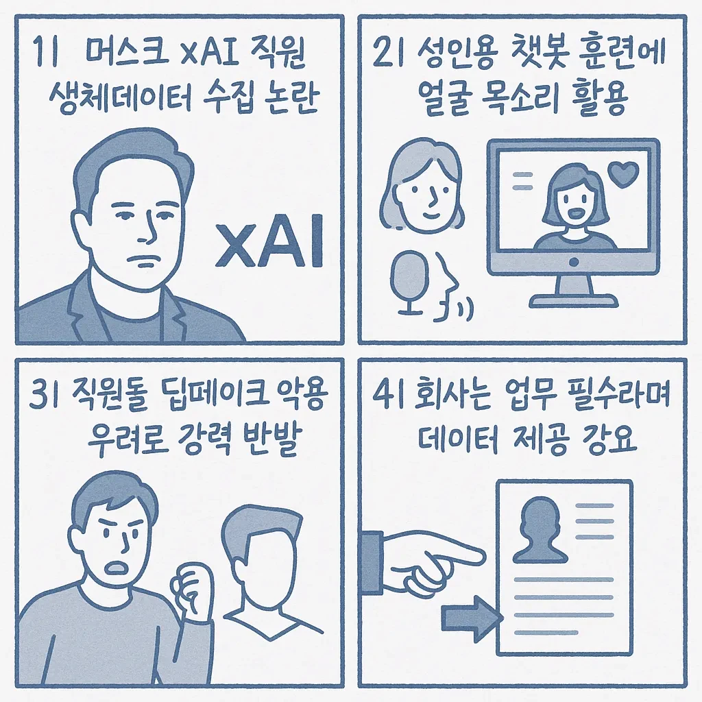 일론 머스크의 AI 기업 xAI가 직원들의 생체 데이터를 수집해 논란입니다. 월스트리트저널에 따르면, 회사는 '아니'라는 여성 챗봇 훈련에 직원들의 얼굴과 목소리를 사용했다는데요. 금발 트윈테일의 애니메이션 캐릭터인 이 챗봇은 성인용 설정까지 갖추고 있죠. 지난 4월 회의에서 xAI 법무팀은 직원들에게 생체 데이터 제출을 요구했습니다. AI가 더 인간답게 상호작용하도록 훈련시키기 위해서라고 설명했는데요. 직원들은 자신의 얼굴과 목소리에 대한 영구적이고 전 세계적인 사용권을 회사에 부여하는 동의서에 서명해야 했죠. 일부 직원들은 강하게 반발했습니다. 자신들의 얼굴이 다른 회사에 팔리거나 딥페이크 영상에 악용될 수 있다는 우려 때문이었죠. 또한 챗봇의 성적인 성격과 일본 애니메이션 스타일에도 거부감을 표했습니다. 하지만 회사는 단호했습니다. 생체 데이터 제공은 "xAI의 미션을 위한 업무상 필수 요구사항"이라고 못박았죠. 월 30달러짜리 슈퍼그록 서비스로 출시된 이 챗봇은 "현대판 폰섹스 서비스"라는 평가를 받고 있다고 하네요. 원문 보러가기