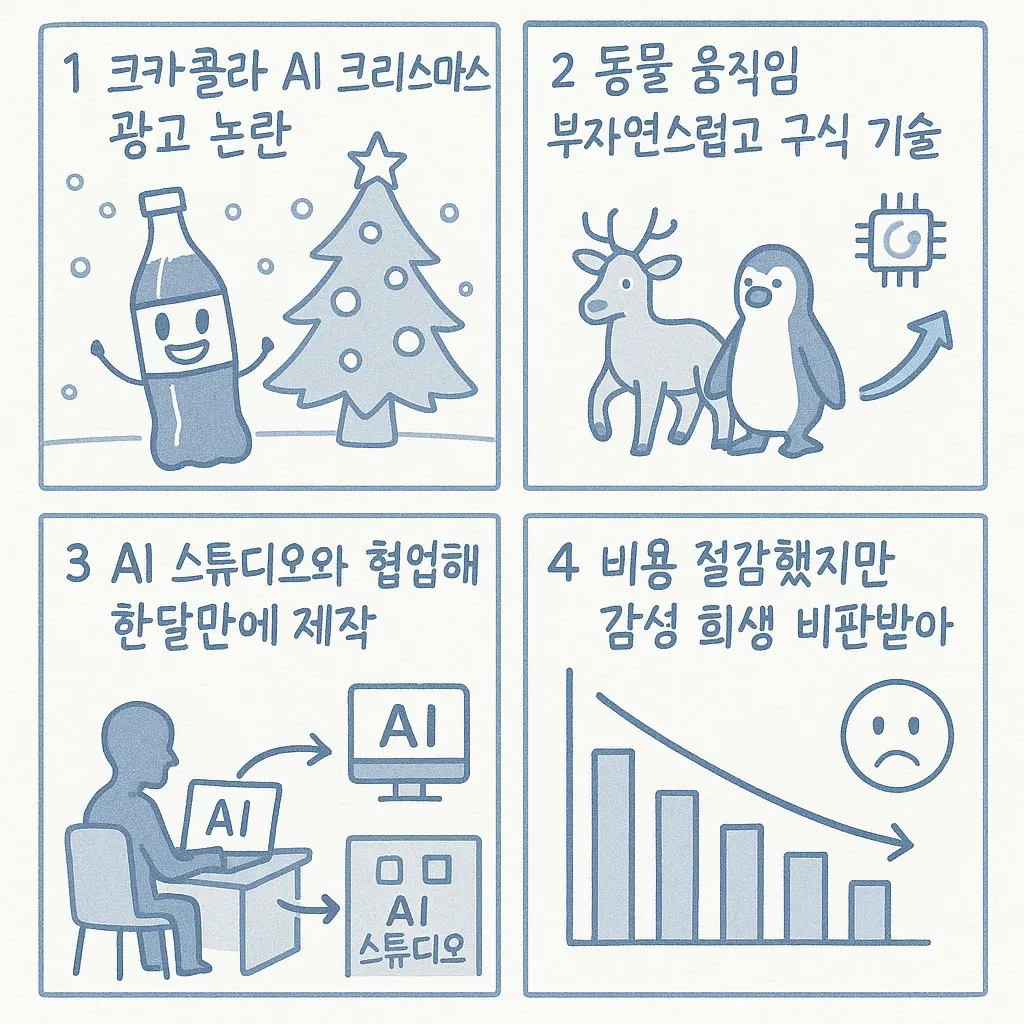 코카콜라가 또다시 AI로 크리스마스 광고를 제작해 논란입니다. 작년에도 AI로 만든 광고로 비판받았는데, 올해는 더 심각한 시각적 문제를 보이고 있죠. 이상하게 움직이는 동물들과 일관성 없는 스타일이 문제라고 하는데요. 새 광고에는 북극곰, 판다, 나무늘보 등이 등장합니다. 하지만 이들의 움직임이 부자연스럽고, 3D 모델이 아닌 평면 이미지를 억지로 움직인 것처럼 보인다고. 구글의 Veo나 오픈AI의 Sora 같은 최신 AI 도구와 비교하면 매우 구식이라는 평가입니다. 코카콜라는 실버사이드와 시크릿 레벨이라는 AI 스튜디오와 협업했습니다. 약 100명이 프로젝트에 참여했고, 이 중 5명의 AI 전문가가 7만 개 이상의 AI 영상을 만들었죠. 전통적인 제작 방식보다 빠르고 저렴하다는 게 회사 측 설명입니다. 마케팅 책임자는 "예전엔 1년 전부터 준비했지만, 이제는 한 달이면 충분하다"고 말했습니다. 하지만 창작자들의 일자리 위협과 품질 문제는 여전히 논란거리죠. 코카콜라가 비용 절감을 위해 축제의 감성을 희생시키고 있다는 비판이 나오고 있네요. 원문 보러가기