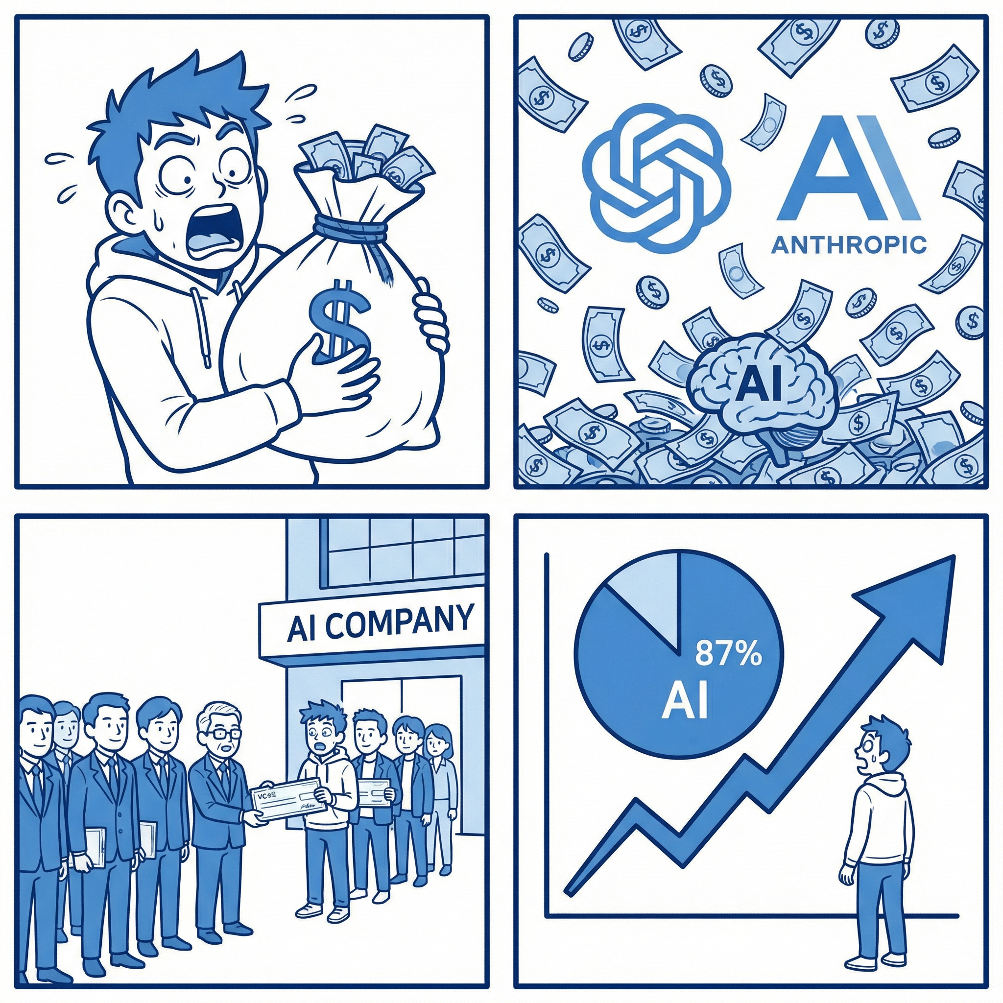 2026년 1분기 북미 벤처캐피털 투자가 전례 없는 기록을 세웠다. 크런치베이스 데이터에 따르면 미국과 캐나다 스타트업이 시드부터 성장 단계까지 유치한 총 투자액은 2,526억 달러(약 374조 원)로, 역대 분기 최고치를 경신했다. 이 수치는 직전 분기 대비 3배 이상이며, 기존 분기 최고 기록이었던 2021년 3분기의 957억 달러를 압도한다. 크런치베이스의 표현을 빌리면 '경신'이 아니라 '분쇄(smashed)'에 가깝다. 규모를 가늠하는 기준점 하나 OpenAI 단 한 건의 투자 라운드가 기존 역대 분기 최고 기록 전체보다 컸다. OpenAI는 2월 아마존, 엔비디아, 소프트뱅크 주도로 1,100억 달러(약 163조 원)를 유치하고, 3월에 120억 달러를 추가로 조달했다. 나머지 상위 4건의 투자 합산도 기존 분기 최고치에 맞먹었다. 앤트로픽 시리즈 G 300억 달러, xAI 시리즈 E 200억 달러, Waymo 시리즈 D 160억 달러가 상위권을 채웠다. AI가 전체 투자의 87%를 차지 AI 관련 카테고리로 흘러들어간 투자액은 2,210억 달러(약 327조 원)로 전체의 87%에 달한다. 직전 분기 AI 투자 총액 대비 6배 수준이다. 후기 및 성장 단계 투자는 전체의 88%인 2,224억 달러를 기록했다. 주목할 점은 투자 건수가 아니라 건당 규모가 폭발적으로 커졌다는 것이다. 후기·성장 단계 라운드 건수는 오히려 직전 분기 대비 소폭 감소했다. 더 큰 베팅이 더 적은 수에 집중되는 양상이다. 초기 단계도 3년 만에 최고 기록 경신은 대형 딜에만 국한되지 않았다. 시리즈 A·B 수준의 초기 단계 투자도 251억 달러로 전년 대비 56% 증가하며 3년 이상 만에 가장 높은 분기 수치를 기록했다. 시드 단계 역시 10억 달러를 넘어 3년 만의 최고치를 보였다. 전 단계에 걸쳐 동시에 기록이 나온 것은 이례적이다. 패러다임 전환인가, 버블인가 크런치베이스는 이번 분기를 단순한 기록 경신이 아니라 '패러다임 전환(paradigm shift)'의 신호로 해석한다. AI 인프라와 에이전틱 AI 응용 분야에 대형 LP들의 자본이 집중되면서, 2026년 AI 투자 사이클이 단순한 하이프 국면을 벗어나 구조적 재편으로 굳어지고 있다는 평가다.