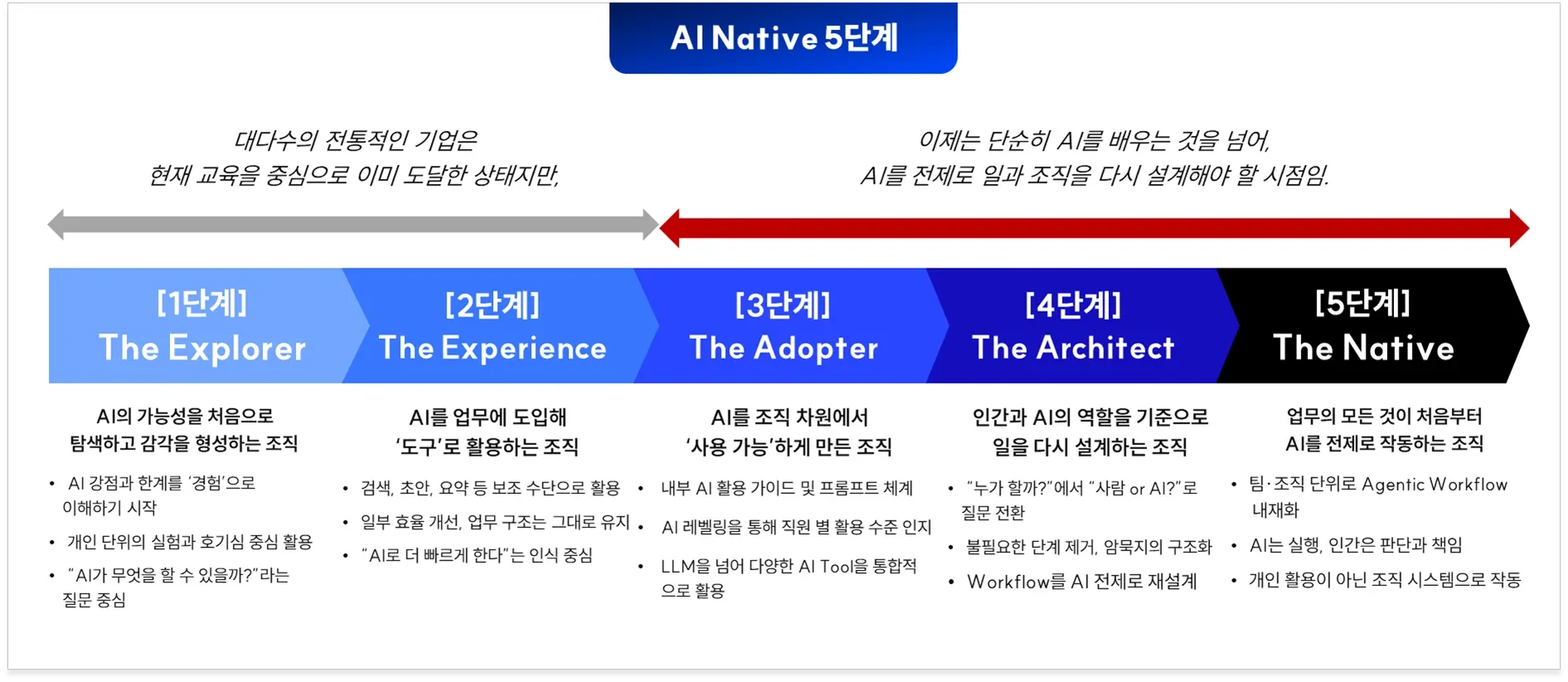 AI Native 5단계는 완성된 모델이 아니다. 국내외 기업에서 교육을 진행하며, HRD 담당자와 리더들이 반복해서 던진 질문,그리고 그 대화 속에서 드러난 공통점을 단계의 형태로 정리한 가설에 가깝다.