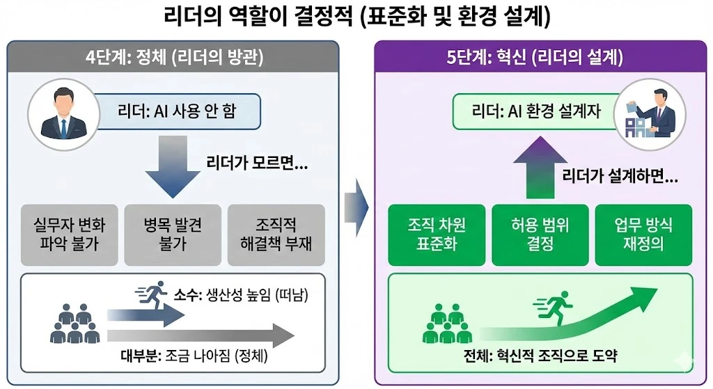 반면 5단계로 넘어가는 조직은 다르다. 리더가 AI를 '배우는 사람'이 아니라, AI 환경을 설계하는 사람이 되기 시작한다.