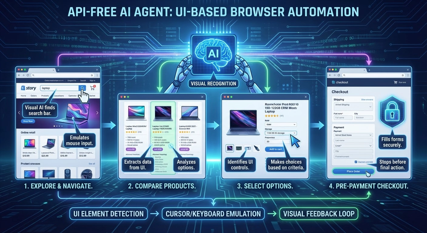 API 없이도 브라우저 UI를 클릭·입력해 작업을 수행하는 AI 에이전트 흐름(탐색→비교→옵션선택→결제 직전)