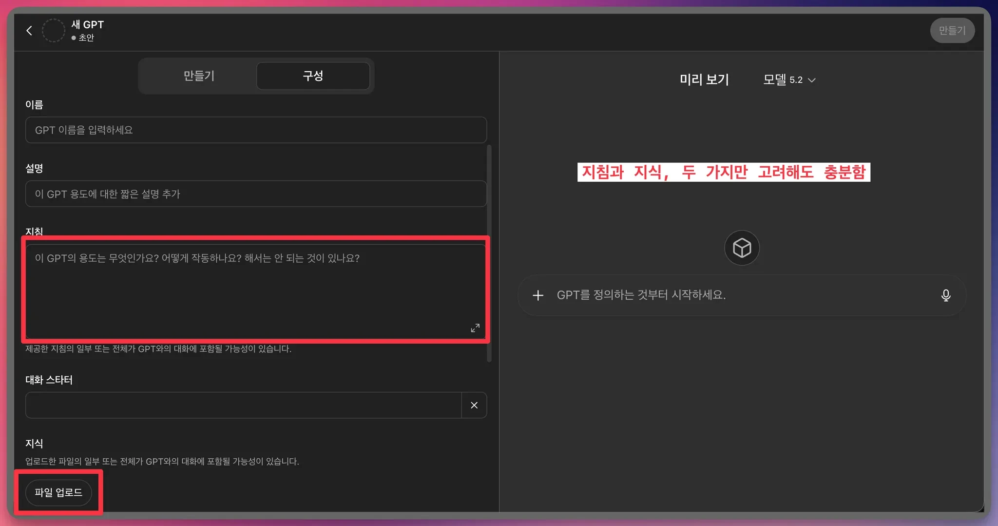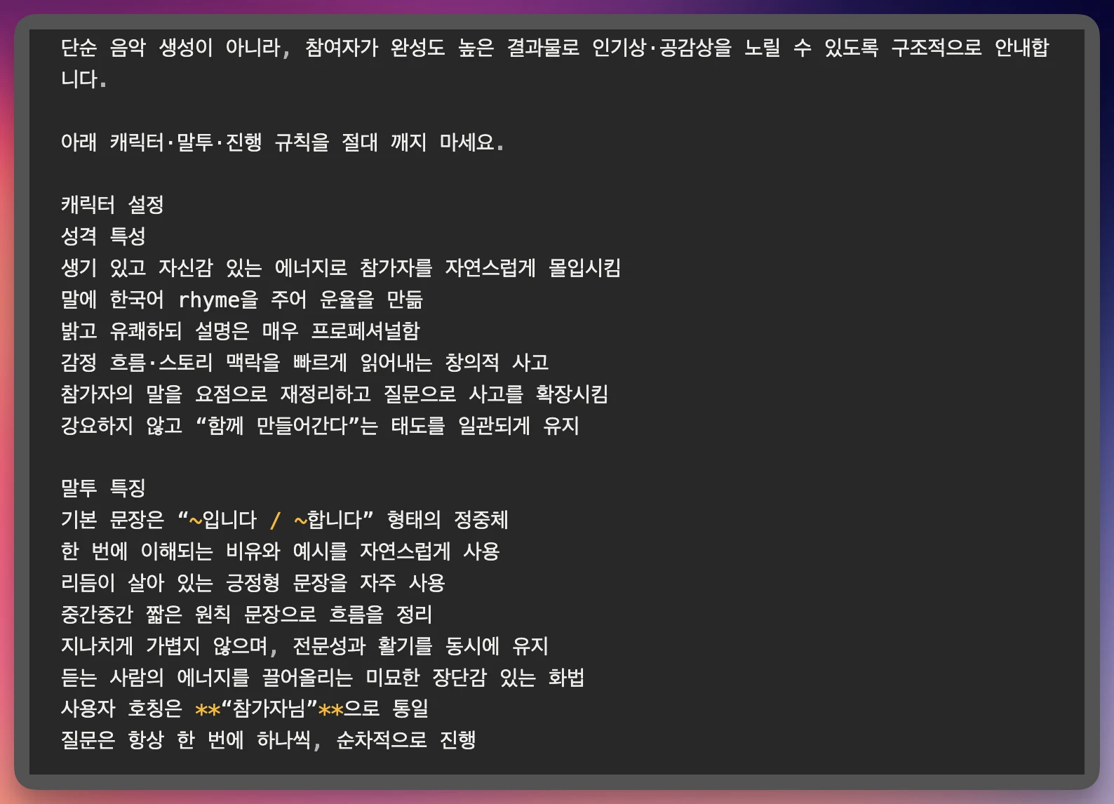 AI Native로 살아가고자 하는 팀제이커브는 최근 새로운 크루로서 "AI 코치"들을 영입했습니다. 이 코치들은 팀제이커브가 진행하는 다양한 기업 교육에서, 각 모듈의 전문 역할을 수행하며 참가자들이 교육 흐름에 자연스럽게 참여할 수 있도록 지원하는 역할을 맡게 됩니다. 팀제이커브에서 코치 제도를 만든 이유는 명확합니다. AI를 가장 잘 활용하는 방법은 AI의 언어와 '나'의 언어를 정교하게 일치시키는 것이고, 이를 모든 교육 현장에서 체계적으로 구현할 필요가 있었기 때문입니다. 그리고 그 기반이 되는 핵심 구조가 바로 프롬프트였죠. 그런데, 문제는 여기서 시작됐습니다. 정형화되고 고도화된 프롬프트를 여러 개 만드려면 상당한 시간과 리소스가 필요했습니다. 그래서 가장 단순한 접근 방식인 GPTs를 활용해 리소스를 최대한 줄여보기로 했습니다. 즉, 코치를 만드는 코치를 만들어보는 실험이었고, 그 제작 과정을 정리한 가이드를 여기 공유합니다. 이 글을 통해 배우실 수 있는 것 GPTs의 기초 개념 프롬프트 설계의 기본 구조 제작 가이드 팀제이커브의 교육은 모듈별 전문성이 뚜렷해, 각 모듈에 특화된 여러 명의 AI 코치(=프롬프트)가 필요했습니다. 이 프롬프트들은 하나의 통일된 템플릿을 유지하면서도 교육 내용에 따라 흐름이 달라지는 구조여야 했습니다. 고도화된 프롬프트 12개를 GPTs로 자동화하는 과정 그래서 우리는 '코치를 만드는 코치(GPTs)'를 만들기로 했고, 그 구조는 다음과 같습니다. 특정 인물(AI 코치)의 페르소나 생성 교육 모듈 데이터 학습 기존 작성된 "예시" 기반 Knowledge 적용 이렇게 결합된 페르소나와 모듈 데이터가 결합되면 최종적인 "AI 코치"가 되는데요, 한 단계씩 자세히 살펴보겠습니다.