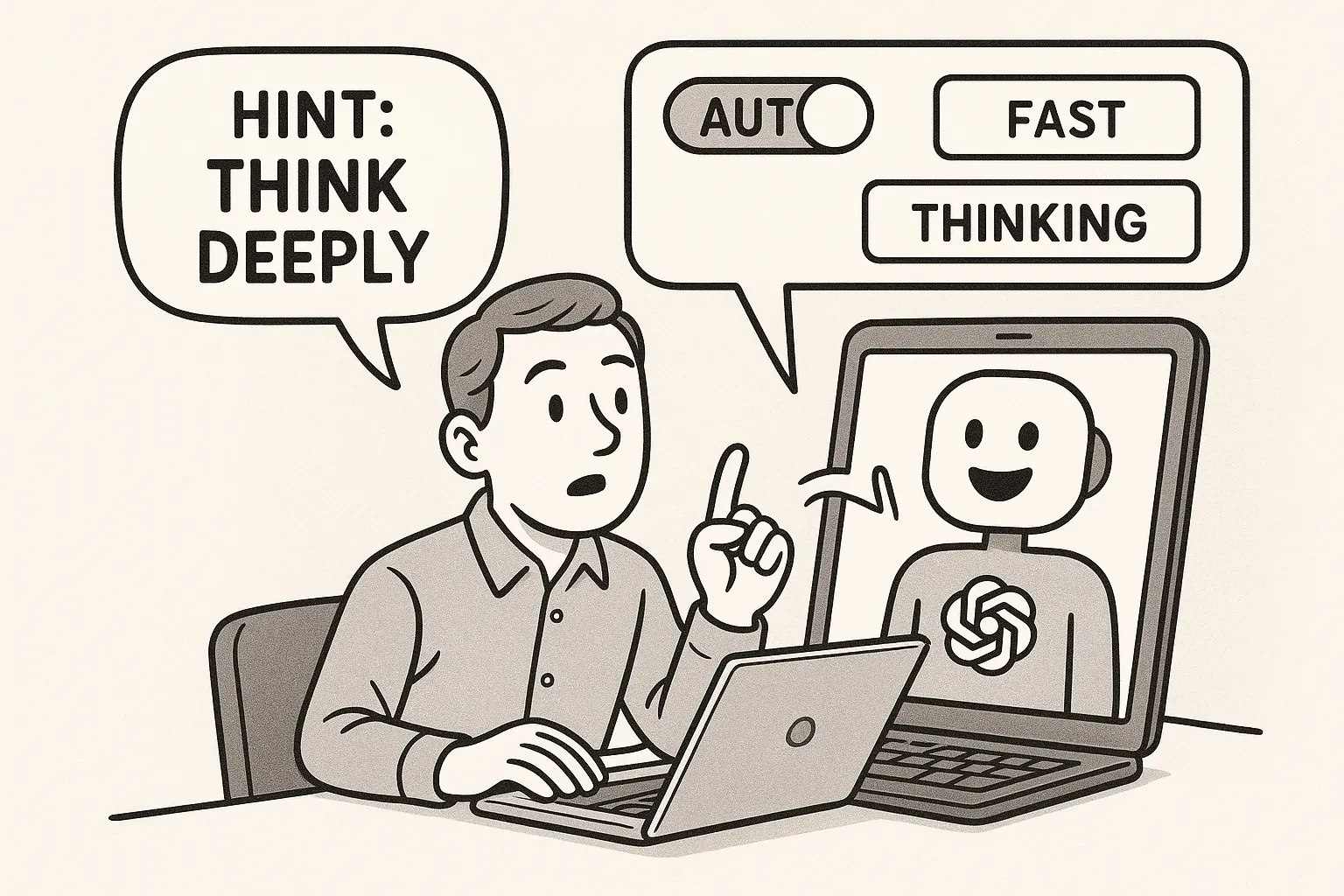 GPT-5는 질문의 난이도를 보고 자동으로 빠른 답변과 깊은 사고를 오가며 조절합니다. 하지만 사용자가 원하는 방식과 모델의 판단이 늘 일치하지는 않아요. 그래서 간단한 힌트 문구를 덧붙이면 GPT-5가 더 정확히 방향을 잡습니다.