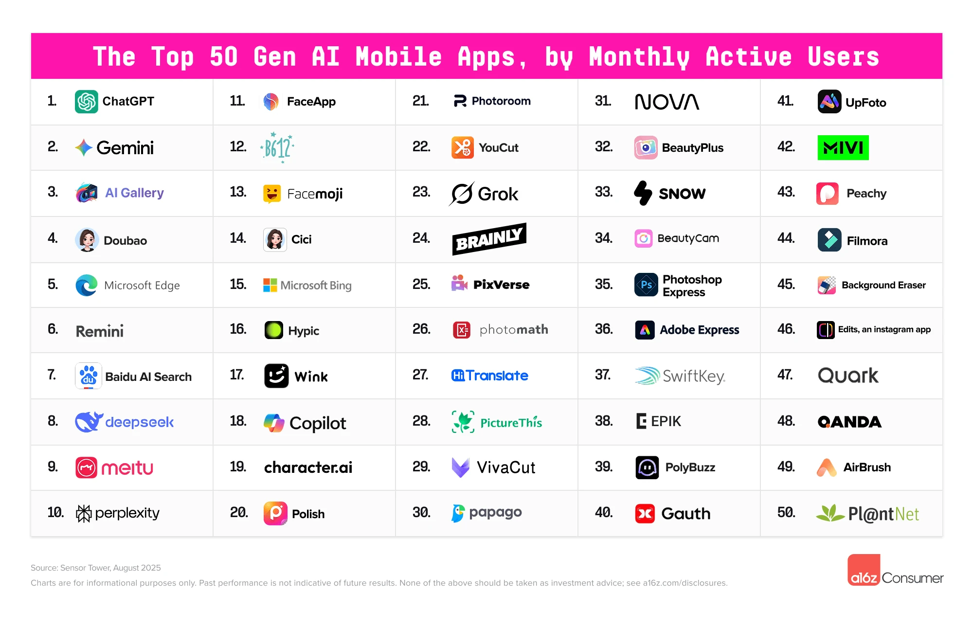 Key Takeaways • Big Tech Showdown: Google Gemini challenges ChatGPT's dominance, reaching #2 on web and half the mobile user base • Chinese AI Army Emerges: 3 apps in web top 20, 22 out of 50 mobile apps are Chinese-developed, conquering global markets • Coding Revolution Accelerates: Lovable surges to #22, AI-powered app generation era fully underway • Ecosystem Consolidation: Only 11 new web entrants (down from 17), clear winners and losers emerging • All-Star Club: 14 companies make 5 consecutive top lists, establishing themselves as AI market champions ChatGPT Still maintains its iron grip on the #1 position across both web and mobile platforms, cementing its status as the undisputed leader. However, Google Gemini is mounting a serious challenge, capturing 12% of ChatGPT's web traffic and achieving nearly half of ChatGPT's monthly active users (MAUs) on mobile. The competitive pressure is intensifying, particularly as Chinese rivals gain ground in their home market where ChatGPT faces access restrictions. Google Gemini Google's flagship AI assistant delivered the most impressive performance in this ranking cycle. Securing solid #2 positions on both web and mobile, Gemini has established itself as ChatGPT's primary challenger. Its dominance is particularly striking on Android devices, where it commands 90% of its user base compared to ChatGPT's 60% Android share. Beyond Gemini, Google demonstrated its AI ecosystem strength by placing four products simultaneously in the top 50: AI Studio (#10), NotebookLM (#13), and Google Labs (#39), showcasing a comprehensive AI strategy across developer tools, productivity, and experimental features. Chinese AI Empire Chinese companies are making unprecedented inroads into the global AI landscape. Three Chinese firms cracked the web top 20: Quark (#9), Doubao (#12), and Kimi (#17), all primarily serving Chinese-language users with over 75% of traffic originating from China. The mobile story is even more dramatic, with 22 out of 50 apps developed in China, though only 3 are primarily used within China—revealing a clear "develop in China, export globally" strategy. Chinese video generation models have particularly excelled over Western counterparts, benefiting from concentrated research talent and more permissive intellectual property regulations that likely enable training on copyrighted data. Google's Veo 3, partially trained on YouTube data, represents the first major U.S. breakthrough in this space. Vibe Coding The AI-powered app generation revolution is gaining serious momentum. Lovable made a spectacular leap from the "Brink List" to #22, while Replit also secured a spot in the main rankings. Credit card panel data reveals the staying power of this trend: U.S. user cohorts for major vibe coding platforms show revenue retention exceeding 100% for several months post-signup. This means that even accounting for user churn, remaining cohorts are expanding their monthly spending. The ecosystem effect is evident as related services like Supabase (a database provider) have seen traffic growth lockstep with vibe coding platforms, experiencing significant acceleration over the past nine months compared to prior years. Grok X's AI assistant Grok achieved remarkable mobile growth, scaling from zero to over 20 million monthly active users since its late 2024 launch. July 2025 proved particularly explosive, with nearly 40% user growth driven by the Grok 4 model release (July 9) featuring superior reasoning and real-time search, followed by AI companion avatars (July 14). The anime avatar "Ani," which included NSFW options, proved especially popular at launch. This mobile success story demonstrates how platform integration can rapidly accelerate AI adoption. DeepSeek The poster child of Chinese AI hype is experiencing a dramatic reality check. Web traffic plummeted over 40% from its February 2025 peak, while mobile usage dropped 22% from its high point. This decline highlights the challenge of converting initial buzz into sustained user engagement, serving as a cautionary tale for AI companies riding viral waves without building lasting value propositions. All-Star Club Fourteen companies have achieved the ultimate validation by appearing in all five web top 50 rankings, establishing themselves as the true aristocracy of consumer AI. These "All Stars" span the full spectrum of AI applications: general assistance (ChatGPT, Perplexity, Poe), companionship (Character AI), image generation (Midjourney, Leonardo), image and video editing (Veed, Cutout), voice generation (Eleven Labs), productivity tools (Photoroom, Gamma, Quillbot), and model hosting (Civitai, HuggingFace). Notably, only five of the fourteen maintain proprietary foundation models, while seven utilize API-available or open source models, and two operate as model aggregators—proving that building on existing infrastructure can be more effective than developing from scratch. Geographically, these champions represent just five countries: the U.S., UK (Eleven Labs, Veed), Australia (Leonardo), China (Cutout Pro), and France (Photoroom, HuggingFace). All but two have raised venture funding, with Midjourney remaining famously bootstrapped and Cutout Pro also self-funded.