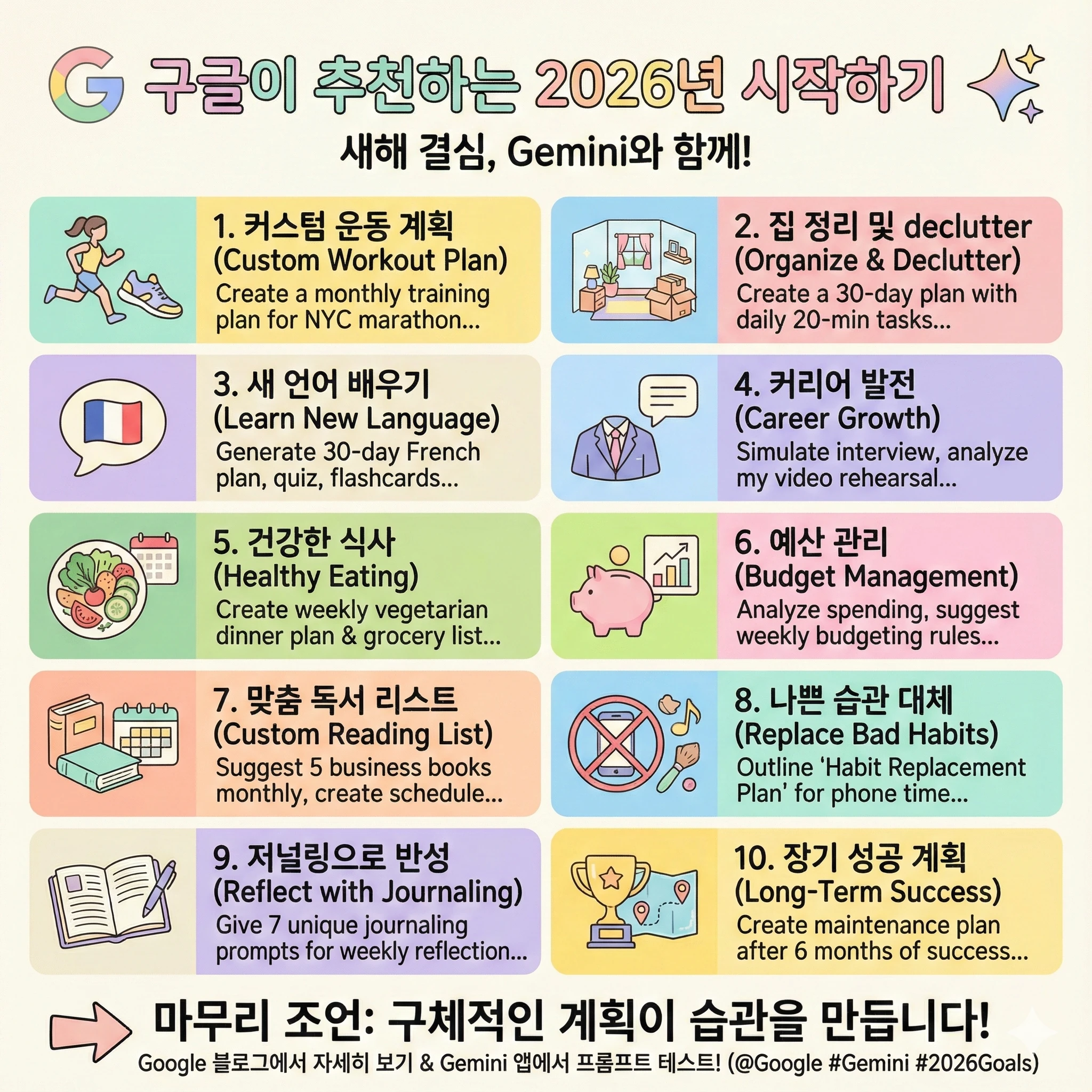 10 | 🏆 유지 | 장기 성공 전략(목표 달성 후 요요 방지 및 다음 단계 설정) | "It's July 1st. I've successfully maintained my resolution to [resolution name] for 6 months. Create a 3-part maintenance plan to help me make this a permanent habit and set a bigger goal for the rest of 2026." |