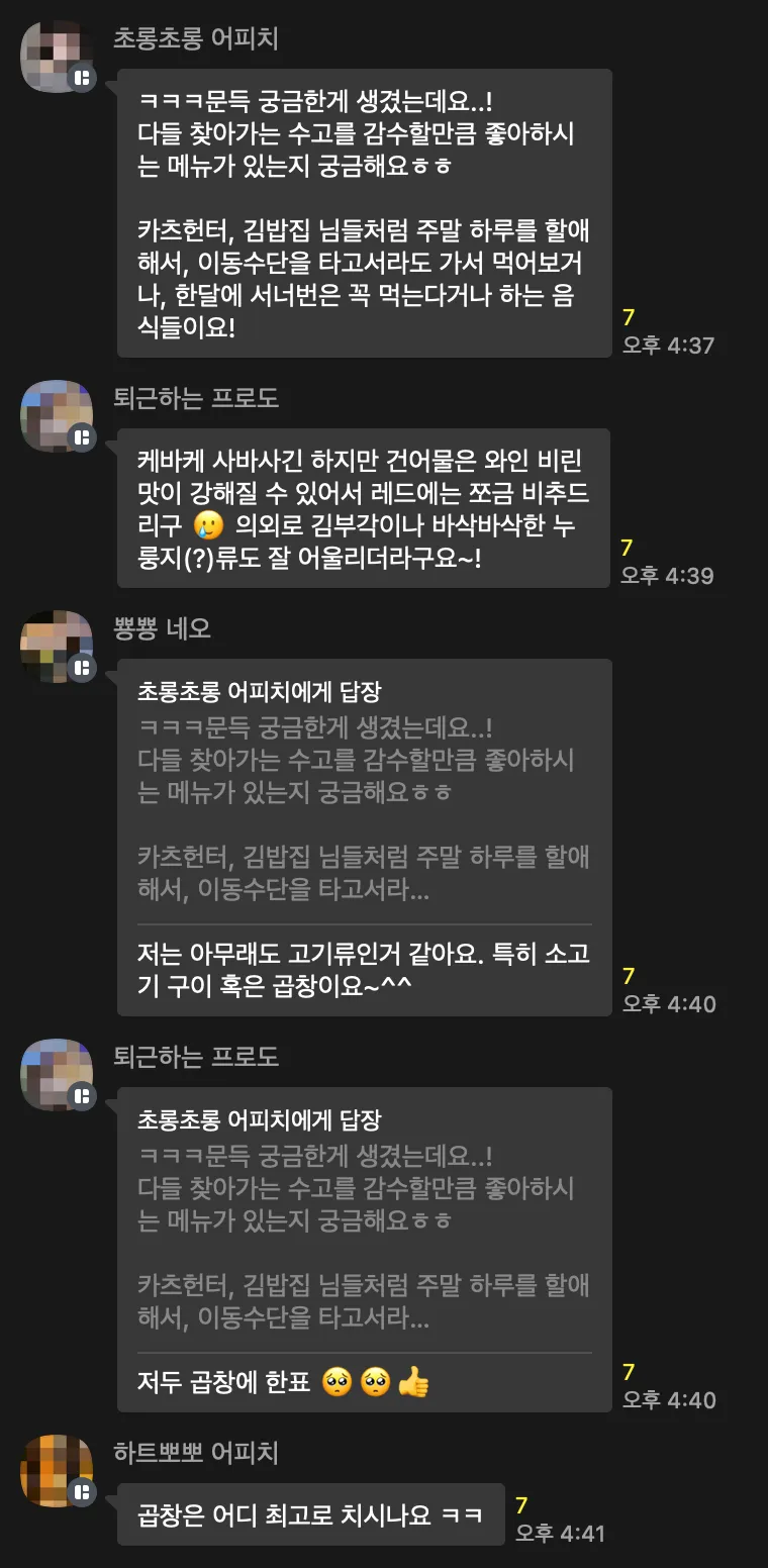 <야식포차> 여기도 좋고, 식사는 여기 <하하> 가 괜찮던데요? 연희동 주민이 직접 추천한 홍상수 영화처럼 눅진한 대화하기 좋은 술집들을 6곳을 추천받았습니다 <맛탐방꾼의 구석구석 서울의 맛> 텐트챗에서 나온 소중한 대화와 정보를 아카이빙합니다 연희동 야식 포차 - https://blog.naver.com/fpdl5/222917497494 2. 연남동 하하 - https://blog.naver.com/kwonstella/223032931620 3. 홍대 bar da - https://blog.naver.com/qkdcodnjs/222810245070 4. 연남동 빠레트(bar) - https://blog.naver.com/flatyoung/223165176078 5. 연남동 이영이주점 - https://blog.naver.com/ssanga85/222423864694 6. 연남동 이자카야, 희로 - https://blog.naver.com/xeowoody/223158313233 <맛탐방꾼의 구석구석 서울의 맛> 텐트챗에서 나온 소중한 대화와 정보를 아카이빙합니다 『<맛탐방꾼의 구석구석 서울의 맛>, 닉네임 <연희동 소월맘>님, 2023년 8월 1일 대화 중』