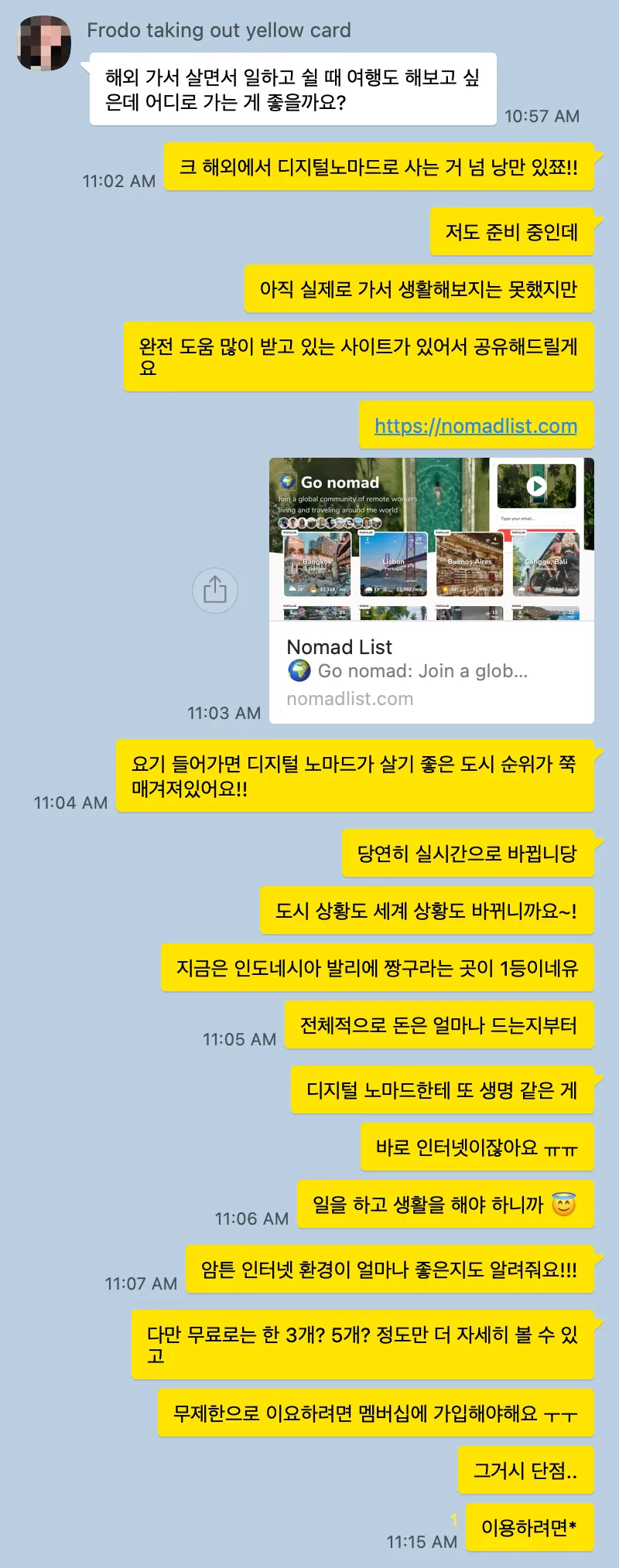 어느 나라에서 일하지? by 노마드지망생노트북 하나만 있다면 어디든 갈 수 있어! 아예 국경을 넘어 가고 싶은데... 어디로 가지? <노마드라이프를 사는 사람들> 텐트챗의 '노마드지망생'님이 공유해주신 대화와 정보입니다소영Aug 11, 2023 11:11 AM