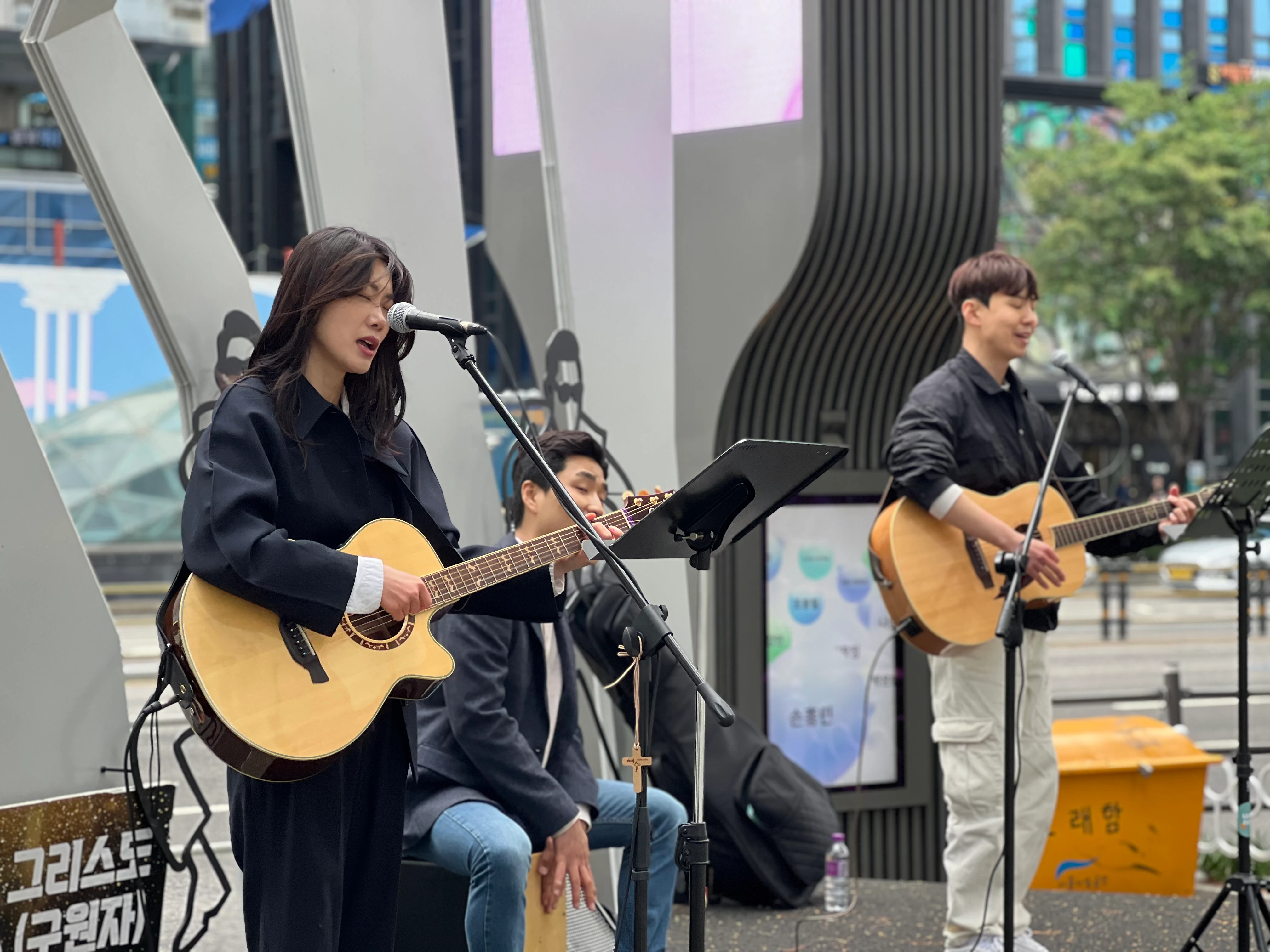 유독 더 바빠보이는 강남역, 홍대 등에서 하나님께 예배를 드리며 아직 하나님을 모르는 사람들을 위해 찬양과 기도를 드립니다
