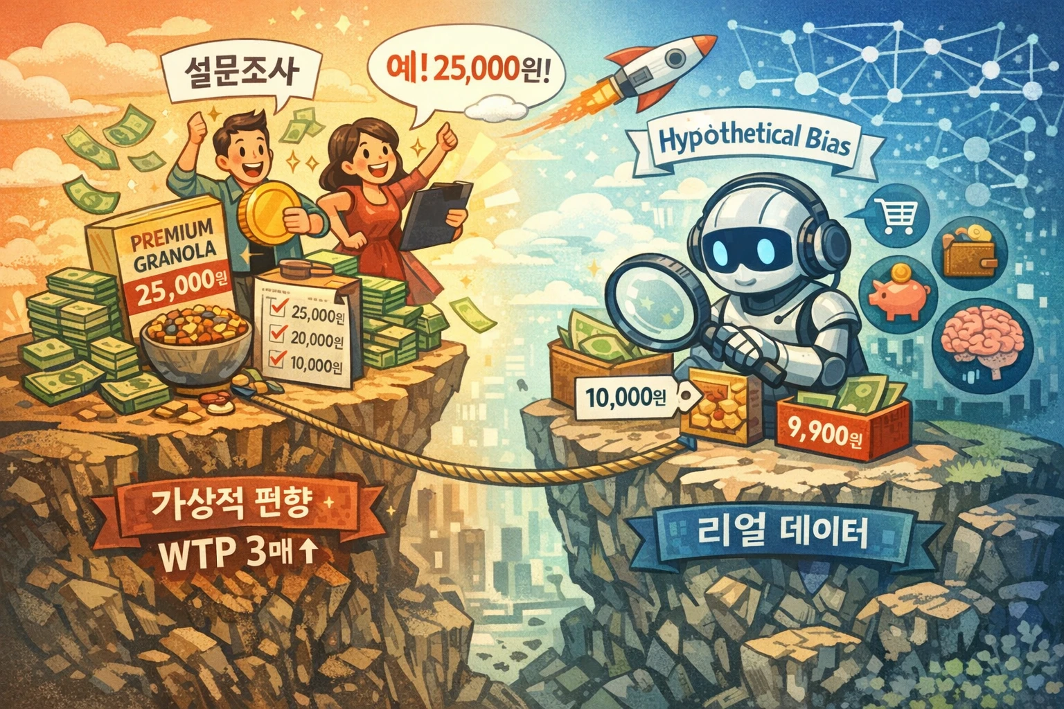 이 질문에 "예"라고 답한 소비자 중, 실제로 지갑을 여는 비율이 얼마쯤 될까요? 설문조사 업계에서 오랫동안 알려진 불편한 진실이 있습니다. 사람들은 가상의 질문에 답할 때, 실제 행동과 다르게 응답합니다. 학술적으로는 이를 "가상적 편향(Hypothetical Bias)"이라 부릅니다. 행동경제학 연구에 따르면 가상 상황에서 보고되는 지불의향(WTP)은 실제 돈이 관련된 상황보다 약 3배 높습니다.