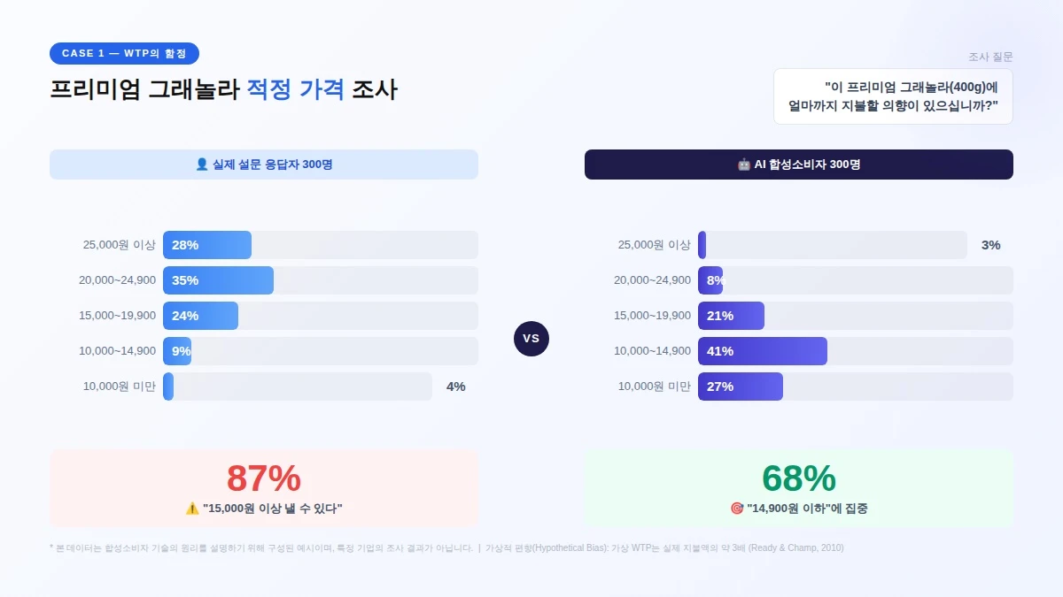 한 프리미엄 그래놀라 브랜드가 신제품(400g)의 적정 가격을 조사했습니다. 실제 설문 응답자 300명과 AI 합성소비자 300명에게 동일한 질문을 던졌습니다. "이 프리미엄 그래놀라에 얼마까지 지불할 의향이 있으십니까?"