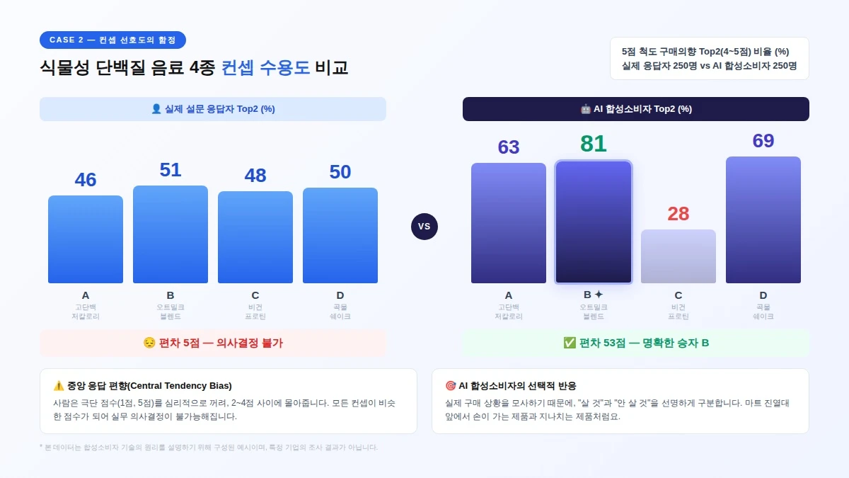AI 합성소비자는 다릅니다. 실제 구매 상황에서의 선택적 반응을 모사하기 때문에, '살 것'과 '안 살 것'을 선명하게 구분합니다. 마트 진열대 앞에 서서 손이 가는 제품과 그냥 지나치는 제품이 명확히 갈리는 것과 같은 이치입니다.