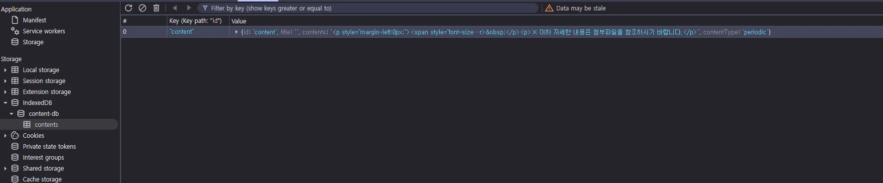 db.createObjectStore('contents', { keyPath: 'id' });