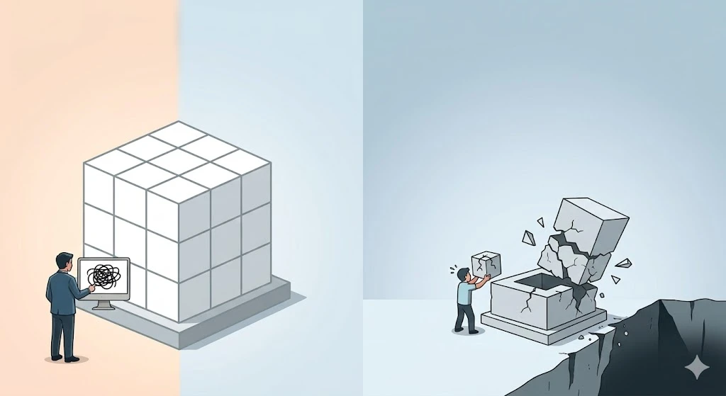 대형 에이전시는 화려한 프레젠테이션, 쾌적한 오피스, 투입 인력 숫자로 높은 견적을 정당화합니다. 하지만 실상은 다릅니다. 실제 개발이 시작되면 프로젝트는 다른 포트폴리오를 짜깁기하는 주니어 개발자들의 '실습장'이 되기 일쑤입니다. 결과물을 마주하는 순간, '이것이 정말 수천만 원의 가치가 있는가'라는 의구심이 드는 이유입니다.