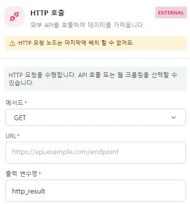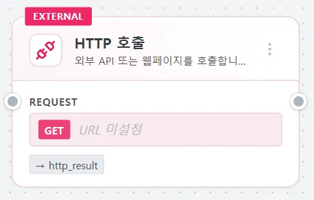 💡 Veluga Agent Tips URL에는 실제로 호출할 API 엔드포인트를 넣어주세요. 출력 변수명에 저장된 응답 데이터는 다음 노드에서 {{변수명}} 형태로 참조할 수 있어요.
