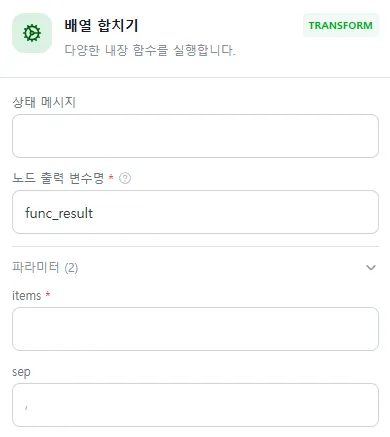 배열 합치기 노드는 배열의 항목들을 하나의 문자열로 합쳐주는 노드예요.