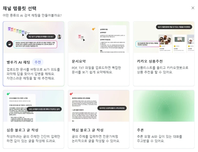 💡 Veluga Channel Builder Tips 어떤 유형을 선택해야 할지 모르겠다면, 「벨루가 AI 채팅」을 추천해요. 가장 범용적인 템플릿으로, 대부분의 챗봇 용도에 적합해요. 이 설명서는 「벨루가 AI 채팅」을 기준으로 작성되어 있어요. 다른 템플릿 내용이 궁금하다면 아래 페이지를 참조하세요.