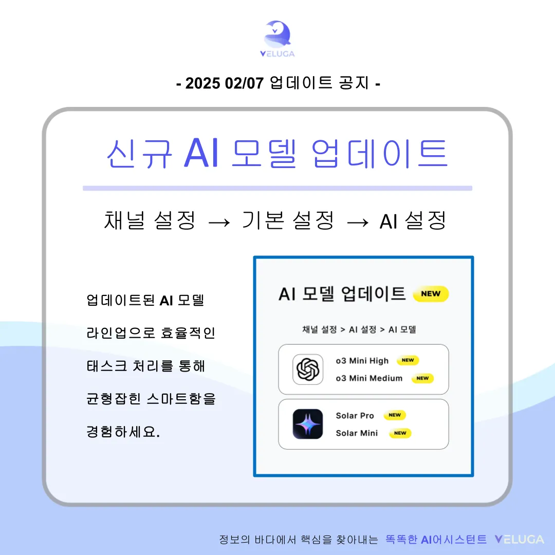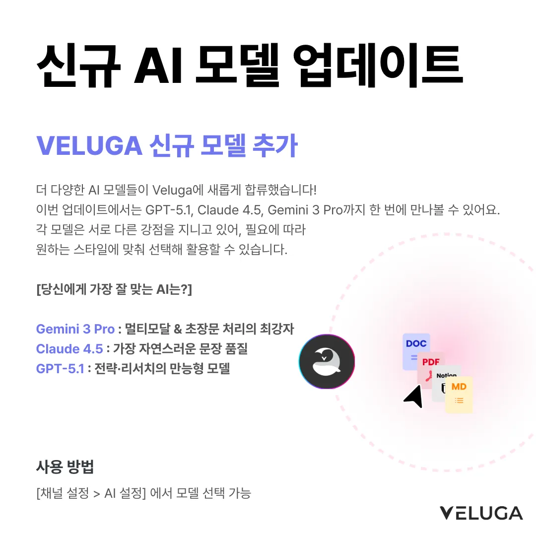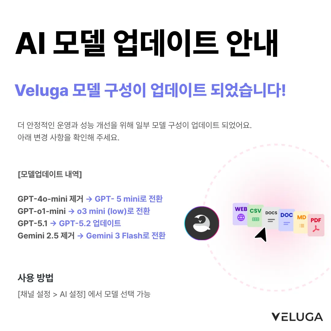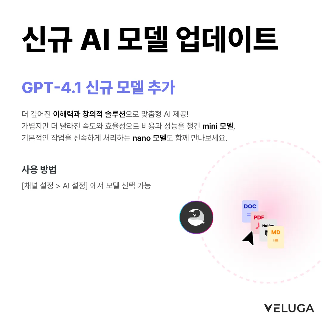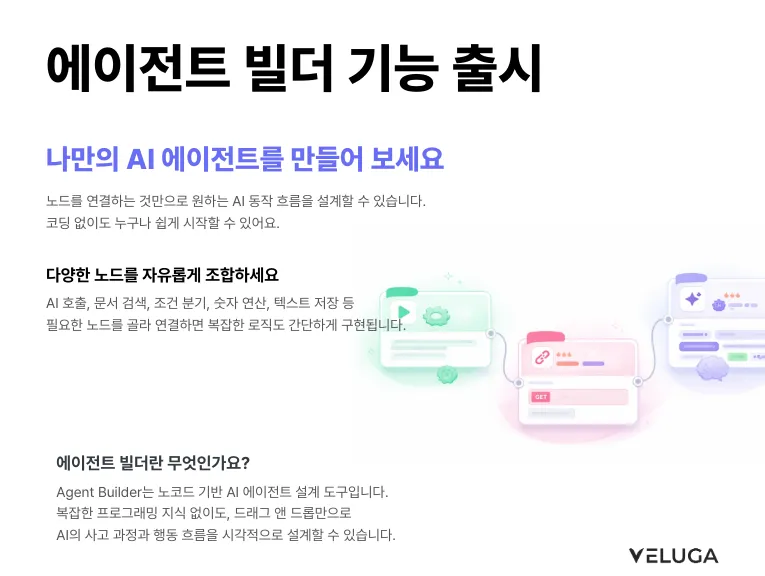 🎉 에이전트 빌더가 새롭게 찾아왔어요! 나만의 AI 에이전트, 코드 없이 뚝딱 만들어 보세요. 안녕하세요, 벨루가팀이에요! 👋 많은 분들이 기다려 주신 에이전트 빌더가 업데이트되었어요. 이번 업데이트로 더 다양한 노드와 기능을 활용해서 나만의 AI 에이전트를 자유롭게 설계할 수 있게 되었답니다. 다양한 기능들이 있지만, 간단하게 소개해드릴게요! 📌 이번 업데이트, 뭐가 달라졌나요? 🧠 핵심 기능 노드 AI 호출 노드 원하는 AI 모델을 골라서 프롬프트를 실행할 수 있어요. 시스템 프롬프트와 유저 프롬프트를 분리해서 더 정교한 응답을 설계할 수 있고, 창의성 조절·반복 제어 같은 고급 설정도 지원해요. 문서 검색 노드 채널에 학습시킨 문서를 검색해서 AI에게 전달할 수 있어요. 키워드/벡터 하이브리드 검색 비중도 직접 조절할 수 있답니다. 🔀 논리 제어 노드 조건 분기 노드 "만약 A이면 → 이쪽으로, 아니면 → 저쪽으로" 같은 흐름을 만들 수 있어요. 여러 개의 조건을 추가하고, 조건에 맞지 않을 때의 기본 경로(Fallback)도 설정할 수 있어요. ƒ 함수 노드 숫자 더하기 · 빼기 · 곱하기 · 나누기