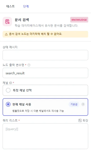 문서 검색 노드는 채널에 학습된 내용을 검색해 올 수 있어요.