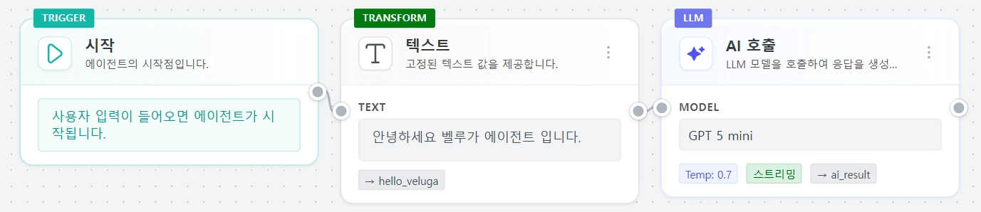 에이전트 빌더는 원하는 노드들을 이어서 내가 원하는 동작 흐름을 구성할 수 있는 기능입니다.