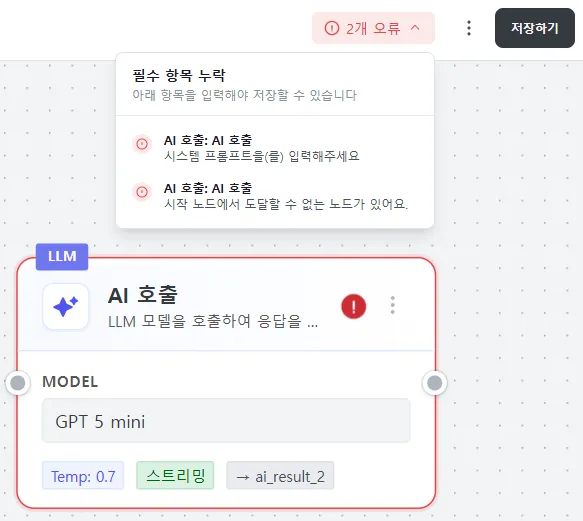 만약 값을 잘못 입력하거나 에러가 난 노드들은 경고를 표시합니다.