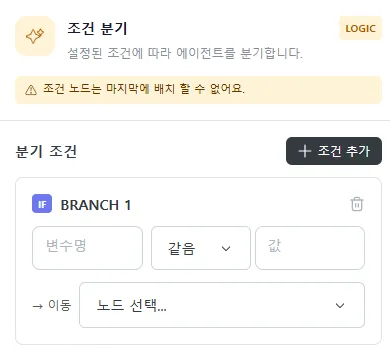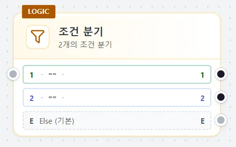 조건 분기 노드는 기본적으로 현재 분기 조건 수에 따라서 나타나는 내용이 달라져요.