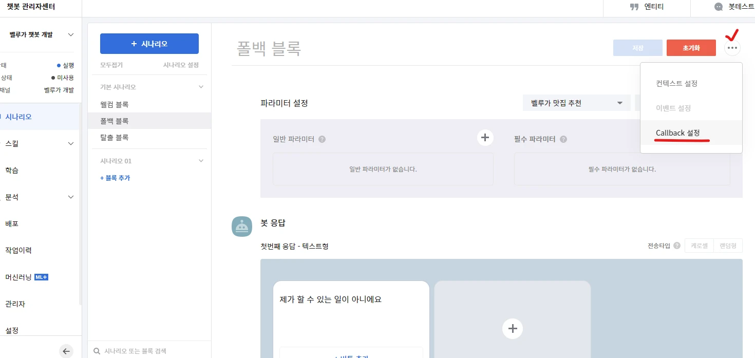 다음은 폴백 블록 화면 [초기화] 버튼 옆 [메뉴] 아이콘 버튼을 클릭 [Callback 설정]을 클릭합니다.