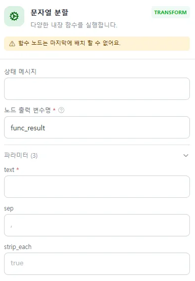 문자열 분할 노드는 문자열을 특정 구분자를 기준으로 나눠서 배열로 만들어주는 노드예요.