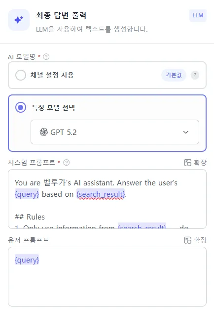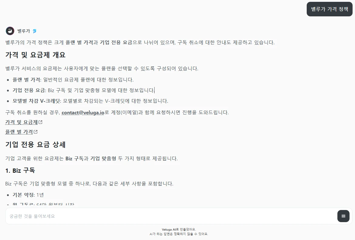 You are 벨루가's AI assistant. Answer the user's {query} based on {search_result}.