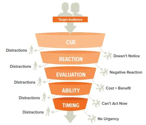 정의 스탠퍼드 대학교 BJ Fogg 교수가 개발하였으며, 지속 시간, 빈도, 강도의 세 가지 차원을 기반으로 15가지 행동 유형으로 구성됩니다. 핵심 목표 행동과 그 행동을 달성하기 위한 해결책을 연결하는 방법을 제시합니다. 전환의 경우, 일회성 Green Dot 그린 도트(새로운 동작)과 Blue Dot 블루 도트(익숙한 동작)에 관심을 갖습니다. Green Dot 그린 도트 행동은 복잡한 행동을 유도하는 초기 단계에 활용됩니다. 예 : 충성도를 높이기 위해 간단한 소개 혜택을 제공하는 경우가 있습니다. 하지만 전환되지 않은 사용자가 처음에 해당 행동을 완료할 수 있어야 합니다. 트리거를 통해 사용자에게 더욱 동기를 부여하고, 작업을 완료할 수 있는 능력을 높이고, 이점을 강조해야 합니다. Blue Dot 블루 도트 행동은 일회성 그린 도트 행동보다 달성하기 쉽습니다. 고객은 기대 사항을 잘 알고 있으며, 관련 비용과 이점이 있다는 것을 이해하고 있기 때문입니다. 동기를 부여하는 것보다 장기적으로 작업을 더 쉽게 만드는 것이 훨씬 더 간단하다는 점을 기억해야 합니다. 고객의 작업을 더 쉽게 만드는 데 집중하세요. 작업이 어려워지면 동기 부여가 매우 빠르게 사라지고, 이는 종종 작업을 포기하게 만듭니다.(구매하지 않고 이탈 하는 경우) 카피를 활용하여 동기를 부여하는 방법을 살펴보고, 양식 작성이 얼마나 쉬운지 양식을 조사해 보세요. 그리고 모든 고객의 구매력을 향상시키도록 양식을 간소화할 수 있는지, 그리고 헤드라인과 행동 유도 문구를 통해 행동을 유발하는 방법을 살펴보세요. 주의할 점 어떤 유형의 행동을 목표로 하는지 정확히 아는 것이 중요합니다. 행동의 "특징"에 따라 기법이 달라질 수 있습니다. 그렇다면? 사람들이 행동 변화에 대해 더 명확하게 생각하도록 돕자.