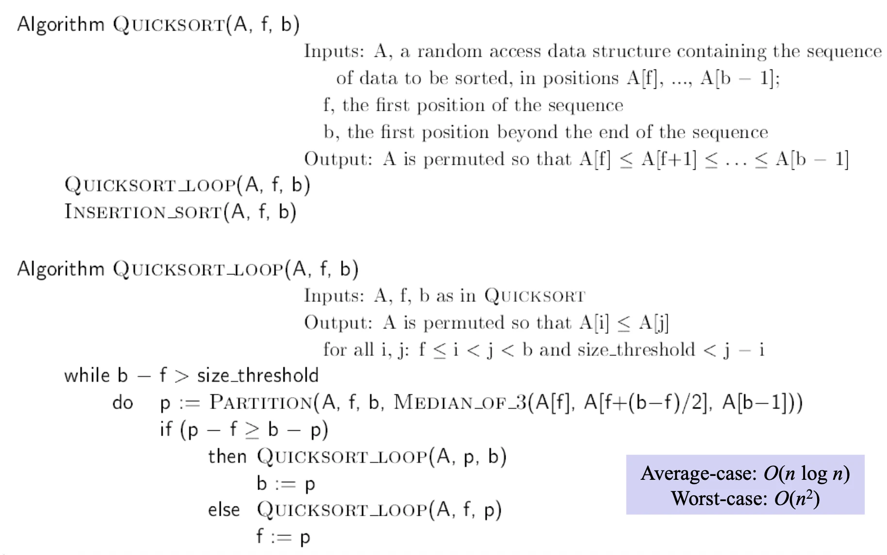 ① 작은 구간은 Insertion Sort로 처리 | if (b - f > size_threshold) 조건 + Insertion_sort(A, f, b) | 재귀 호출 최소화 + 캐시 효율 개선 | |
