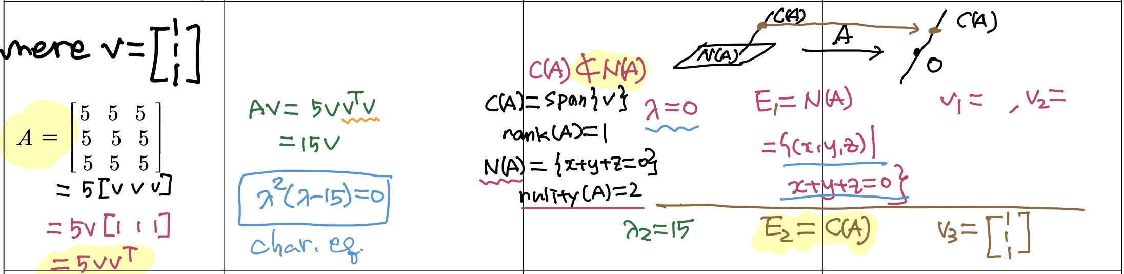 행렬 A를 벡터 v로 표현하고, A=5[v v v] = 5 v[1 1 1] = 5vv^T, Av= 5vv^Tv = 15v