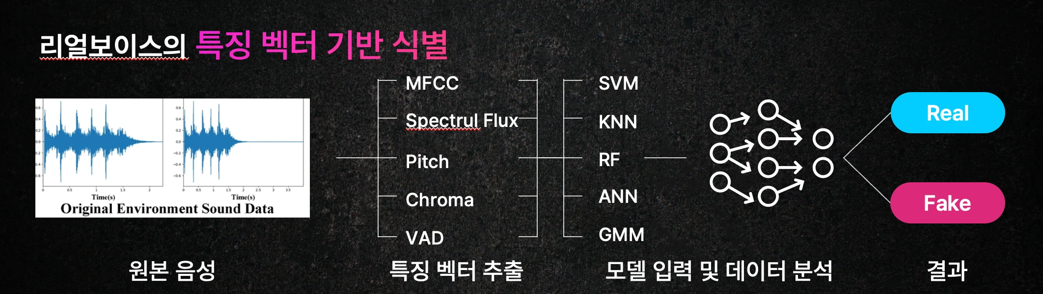 머릿말 군 생활 중 창업의 일부 과정을 경험할 수 있는 좋은 기회를 가졌다. 25년 4월부터 12월까지, 공군창업경진대회부터, 국방부 창업경진대회, 도전 K-Startup챌린지 왕중왕전을 거치며 비즈니스의 형태와 기술을 구체화시켰다. 그 과정에서 배운 점도 많았고, 아쉬웠던 부분도 많았기에 기억이 휘발되기 전에 기록한다. 팀원이 모으기까지 고등학교 선배이자 대학교 과 선배가 될 예정이었던, 반재윤 선배에게 연락이 왔다. 함께 창업경진대회를 나가보자는 제안이었다. 이미 진주에서 2명의 팀원을 더 구했다. 카이스트 전자과를 다니던 준호형과, 숭실대 컴공에서 개발 경험이 많던 재상이 형. 나는 제품개발 겸 PM으로 참여했다. 사실 4명이 팀이기에 모두가 제너럴리스트가 될 수 밖에 없었다. 그중에서도 나는 비즈니스 모델 개발,IR Deck 작성 및 발표, 프로토 제작에 힘을 실었다. 당시에는 AI 분야에 지식이 많이 없어 논문을 겨우 이해하는 수준에 그쳐서이기도 했다. 유용한 기술 & 가치있는 모델 유용한 기술을 찾는다 대회 출품을 위해 아이디어를 브레인스토밍하다가, 과거 AI로 음성 변조 앱서비스를 만들어본 경험이 있는 팀원이 있었다. 당시에는 분간이 쉬웠고, 누구나 사용하는 기술이 아니었다. 하지만 현재의 AI의 발전속도는 금세 사람들이 분간하지 못하는 컨텐츠를 저렴하게 누구나 생성할 수 있을 것이라고 확신했다. 음성 스푸핑 탐지는 꽤나 오래된 분야다. 관련한 기술들은 이미 많은 논문들이 있었고, 음성 스푸핑 영역과 관련한 탐지 솔루션을 다루는 AsvSpoof라는 챌린지도 존재한다. 완전히 새로운 딥보이스 판별 방법론을 개발하는 것은 목표가 아니었다. 기존에 발표된 기술을 발전시켜서, 이 판별 기술이 필요한 도메인에 적절한 비즈니스를 만드는 것을 목표로 했다. 기술 자체는 복잡하지 않다. 지도학습 또는 GAN으로 딥보이스로 학습된 음성의 멜스펙트로그램과 일반 음성의 차이를 학습시킨다는 것. 초기 3트랙 비즈니스 Pure Stream : 미디어 플랫폼 검증 빌트인 API 또는 확장프로그램 미디어 플랫폼에 쉽게 통합할 수 있는 API로, 콘텐츠의 순도와 신뢰성을 검증하여 진정성 있는 스트리밍을 보장합니다. 크롬 확장프로그램으로 미디어플랫폼에서 조회하고 있는 영상이나 음성이 AI에 의해 생성되었을 가능성을 사용자에게 직관적으로 알려줍니다. 더 직접적으로 플랫폼 자체에도 저희 서비스를 제공할 수 있습니다. 자사의 기술은 API로 제공되어 플랫폼 제공자는 민감한 주제나 태그에 AI에 의해 생성되음을 표기하여 공인 사칭이나 범죄 악용 등의 사회적 혼란을 막을 수 있습니다. Artist Anchor : 아티스트 목소리 저작권 보호 통합 솔루션