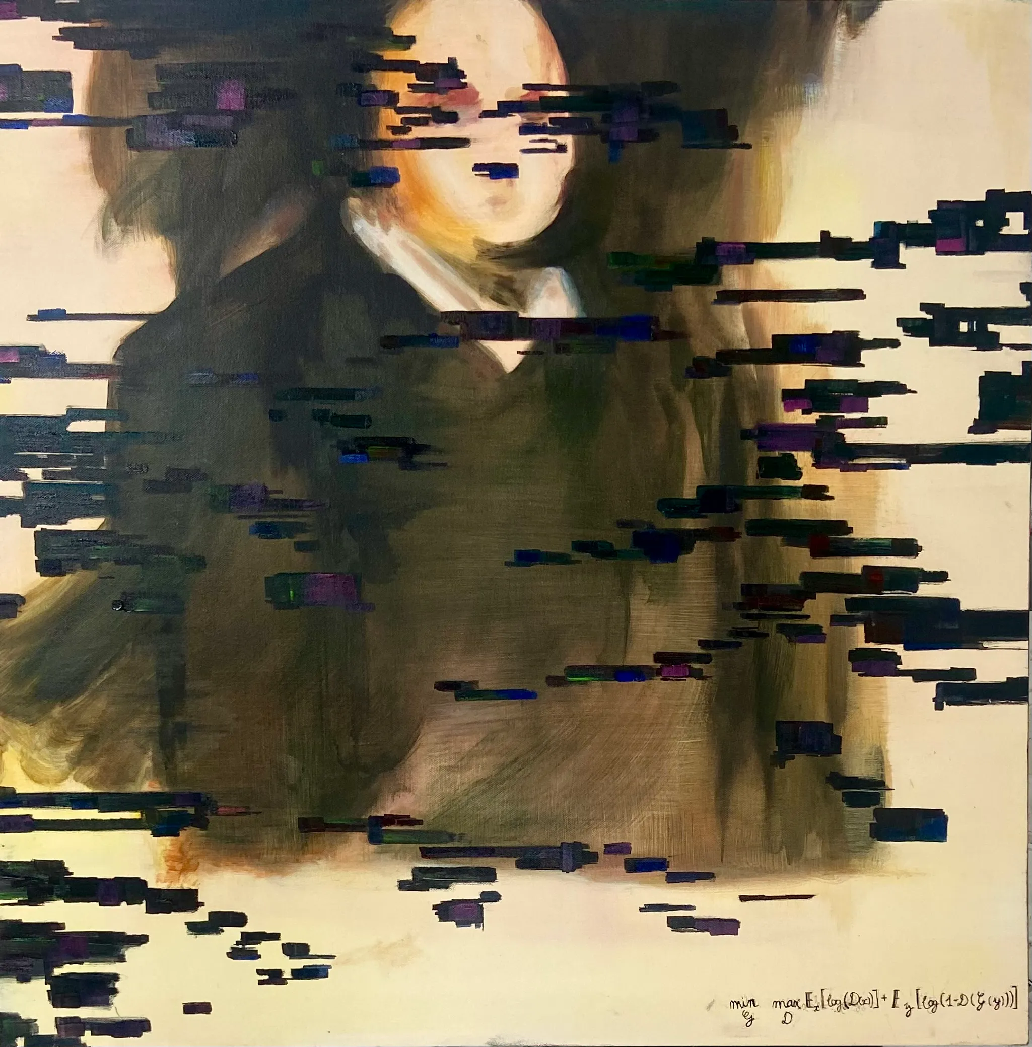 AI 이미지 전유: AI를 참고해서 그린 이미지는 누구의 것인가? <Edmond de belamy>(2018) AI가 만든 가장 대표적인 초상화 작품 : 2018년 프랑스 아트 컬렉티브 Obvious가 제작한 AI초상화로 알고리즘을 활용하여 14세기부터 19세기까지의 15000여 점의 고전 초상화를 학습시켜 만든 작품이다. -흐릿한 얼굴과 고전적인 복장을 한 남성을 묘사하고 있으며 실제로는 존재하지 않는 귀족 인물이다. 오른쪽 하단에는 AI 알고리즘의 수식이 서명처럼 적혀있다. 이 수식은 AI에게 보통의 서명을 대신하며 AI가 창작자임을 상징한다. -이 작품은 2018년 뉴욕 크리스티 경매에서 약 43만 2500달러에 낙찰되었다. 이는 AI가 만든 예술 작품이 주요 경매에 등장한 최초의 사례이다. 김지영, <가상의 흔적>, 2025, 캔버스의 유채, 70x70cm
