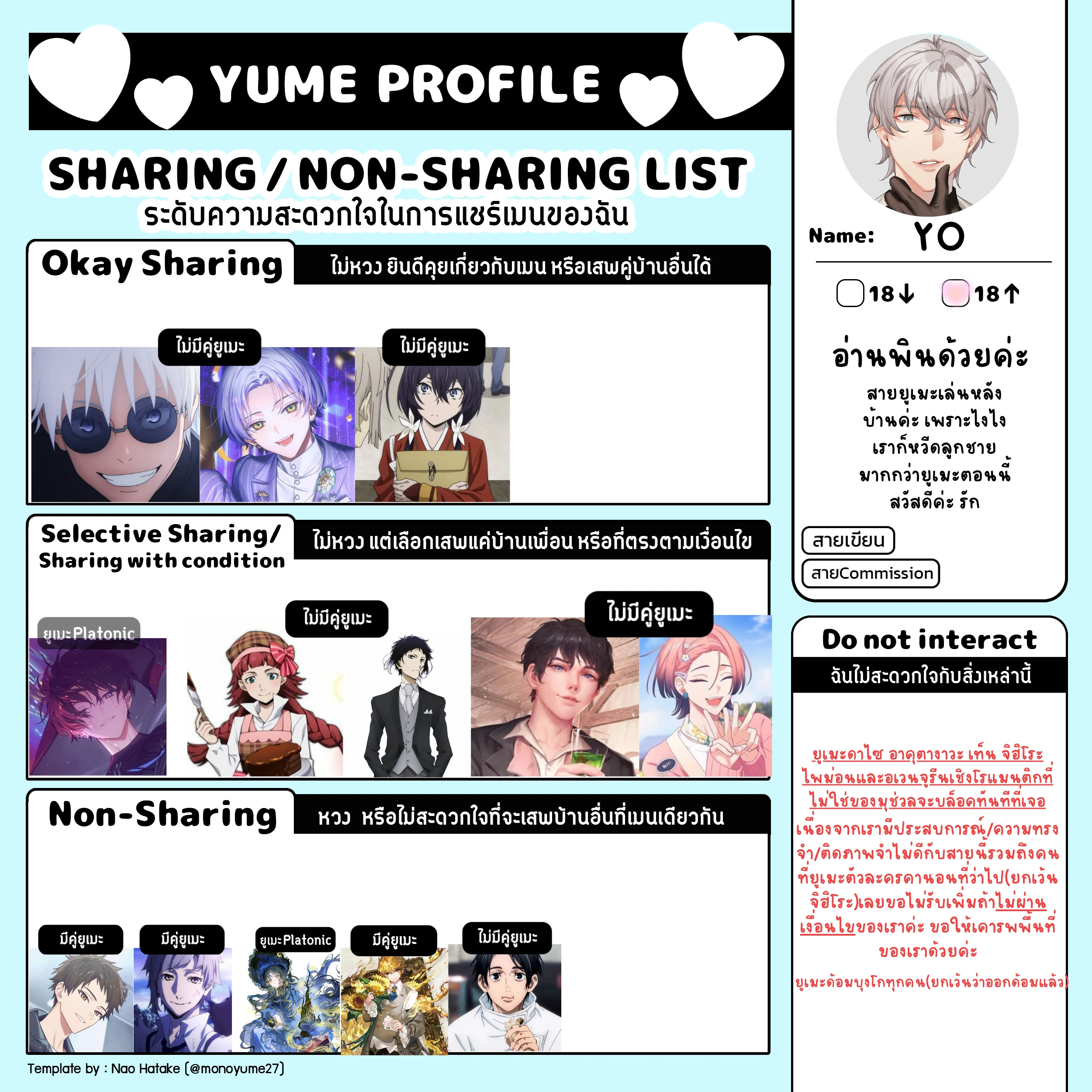 ข้อมูลส่วนที่เผยแล้วเช่น ความสัมพันธ์ อายุ เผ่าพันธุ์ ฯลฯ จะทยอยอัพเดทที่หน้าของ About my characters ตามด้วยชื่อตัวละครที่เกี่ยวเนื่องกัน นอกนั้นอาจจะดรอปฟันแฟทหรืออินสไปร์ตัวละครในกรณีที่คนนั้นเราได้ทำการลงมู/เขียนนิยายไปพอสมควร และลอร์ที่พวกคุณ(ผู้เล่นที่พบเจอในคอมมู)รับรู้นั้นส่วนใหญ่เราจะบิดจากของเวิร์สหลักมาทำให้ไม่ตรงกัน 100% ค่ะ แต่อันไหนตรงกับลอร์เวิร์สหลักจะดูไม่ยากค่ะ