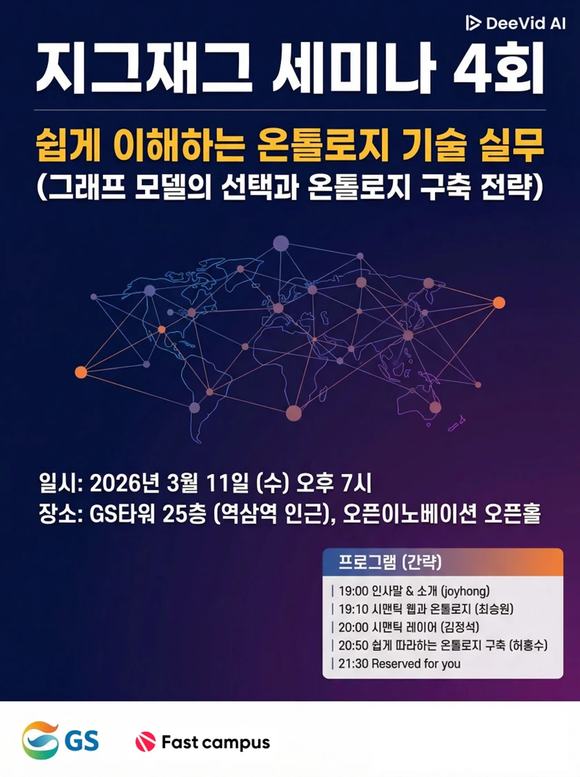 JjoyhongNov 20, 2025차주에 무료 강좌가 열립니다~[오픈세미나] 조직의 흩어진 비정형 데이터를 온톨로지로 구조화하는 의미 기반 AI 전환 전략 | 패스트캠퍼스온톨로지로 비정형 데이터를 ‘의미 구조’로 재탄생시키는 실전 전략! AI 서비스·RAG·추천 시스템에서 활용 가능한 의미 지향 데이터 구조 설계 노하우를 <무료>로 공개합니다!fastcampus.co.kr