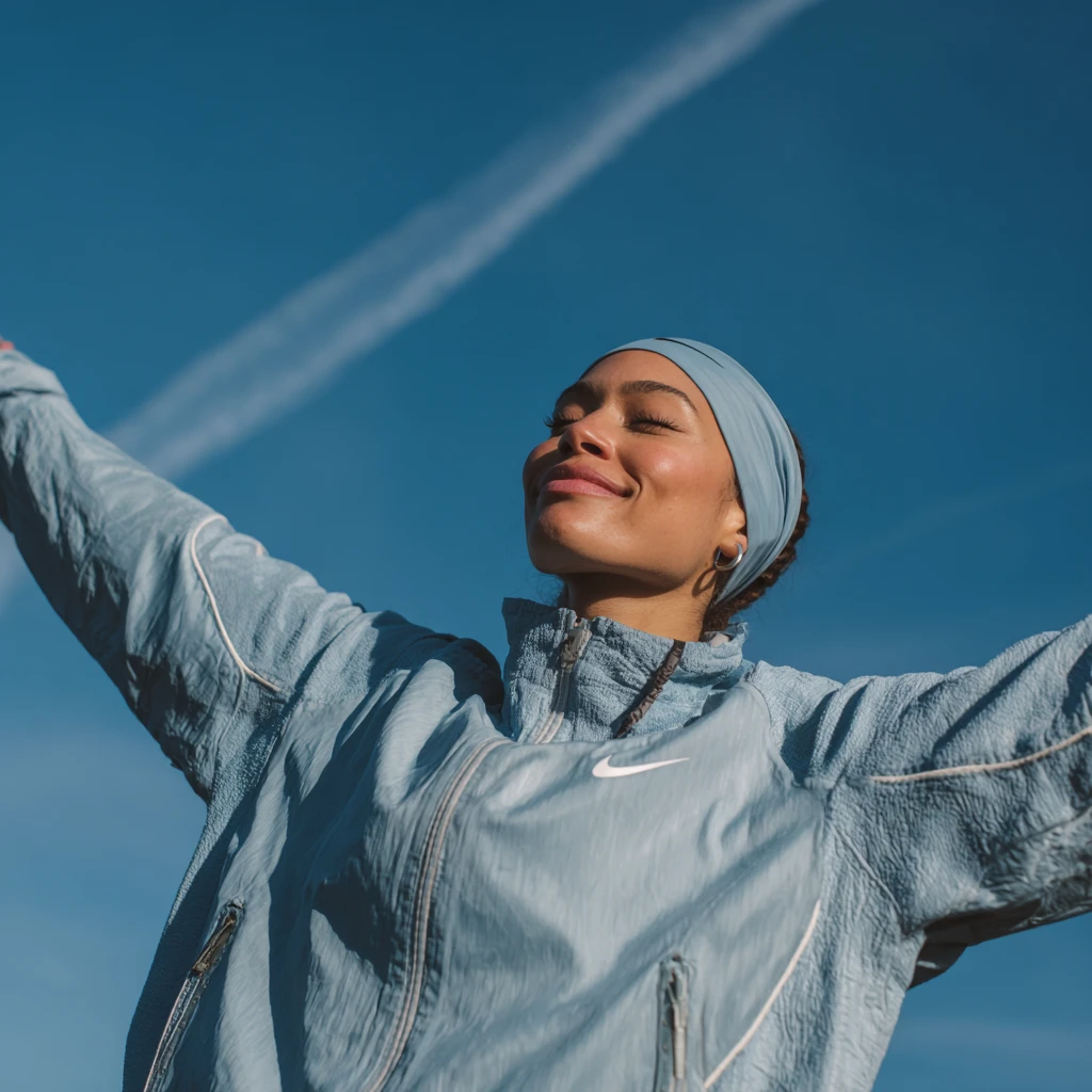 Low angle shot looking up at athletic woman with arms spread wide in victorious pose, wearing powder blue Nike windbreaker jacket and matching Nike headband, dynamic triumphant gesture against clear blue sky, shot from below perspective, energetic and empowering composition, soft focus on face with gentle smile, sharp details on Nike sportswear, natural daylight, bright and airy, slightly overexposed highlights, clean minimal background, just blue sky with single contrail, athletic lifestyle photography, commercial sports advertisement aesthetic, Nike brand campaign style, sense of freedom and achievement, motivational energy, crisp and vibrant colors, professional sports photography, editorial quality, canon 5D style, shallow depth of field on upper body, 35mm lens perspective midjourney made by zoey