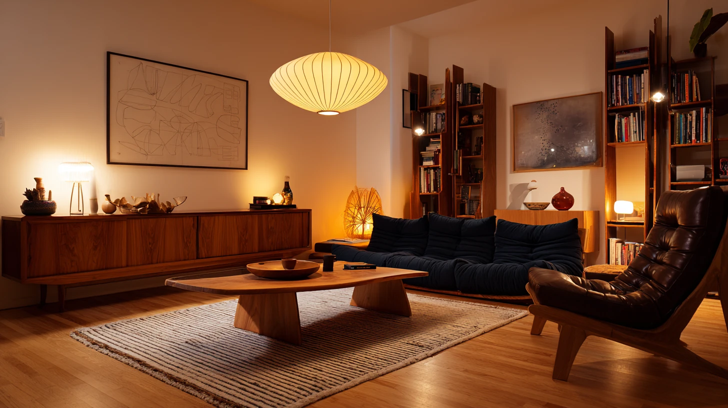 Interior photography of a warm mid-century modern living room at night, soft amber lighting throughout, a deep navy blue Togo-style low floor couch with cushions, a single-seat dark brown leather lounge chair, a solid wood organic-shaped coffee table in the center, a large striped wool rug on warm wooden floor, the back wall has a long wooden credenza with a TV and Noguchi-style paper lantern table lamp, a tall wooden cubby shelf unit on the side filled with design books, ceramic vases, a Korean moon jar, and a small mushroom lamp, a large Akari-style paper pendant lamp hanging from the ceiling, a loosely sketched line drawing artwork on the wall, warm tungsten ambient lighting, cozy evening atmosphere, ultra realistic, Canon EOS R5, 35mm lens, f/4, soft warm tones